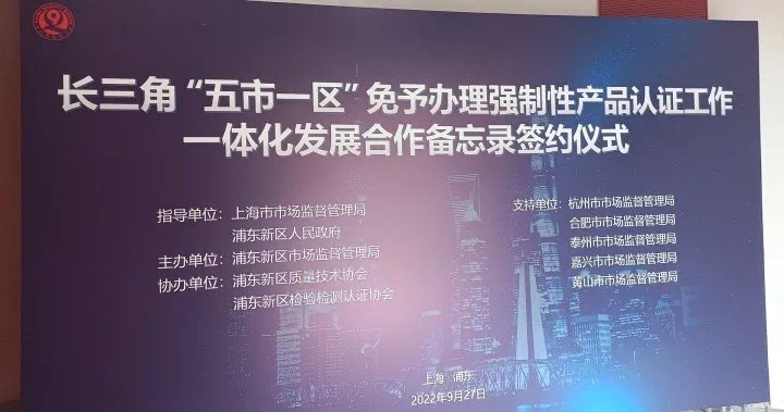9月27日,由上海市市场监督管理局指导,浦东新区人民政府、浦东新区市场监督管理局主办的《长三角“五市一区”免予办理强制性产品认证一体化发展合作备忘录》签约仪式在浦东举行。这是全国范围内CCC免办业务的首次跨区域合作,以《合作备忘录》签订为契机,五市一区市场监管局将率先建立CCC免办工作一体化合作机制和监管格局。