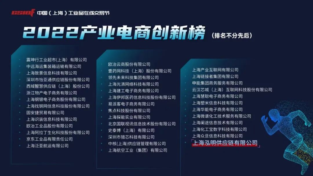 2022年7月6日,泓明入选由上海市电子商务协会和上海长三角产业互联网促进中心联合发布的“2022产业电商创新榜”。作为产业数字化的标杆,泓明在疫情特殊时期,通过数字化供应链承担起专业服务,保障重点生产不断供。作为集成电路产业“粮仓”,为产业上下游企业稳产保供贡献力量。同时泓明用数字化手段与制造业深度融合,赋能企业提质增效。