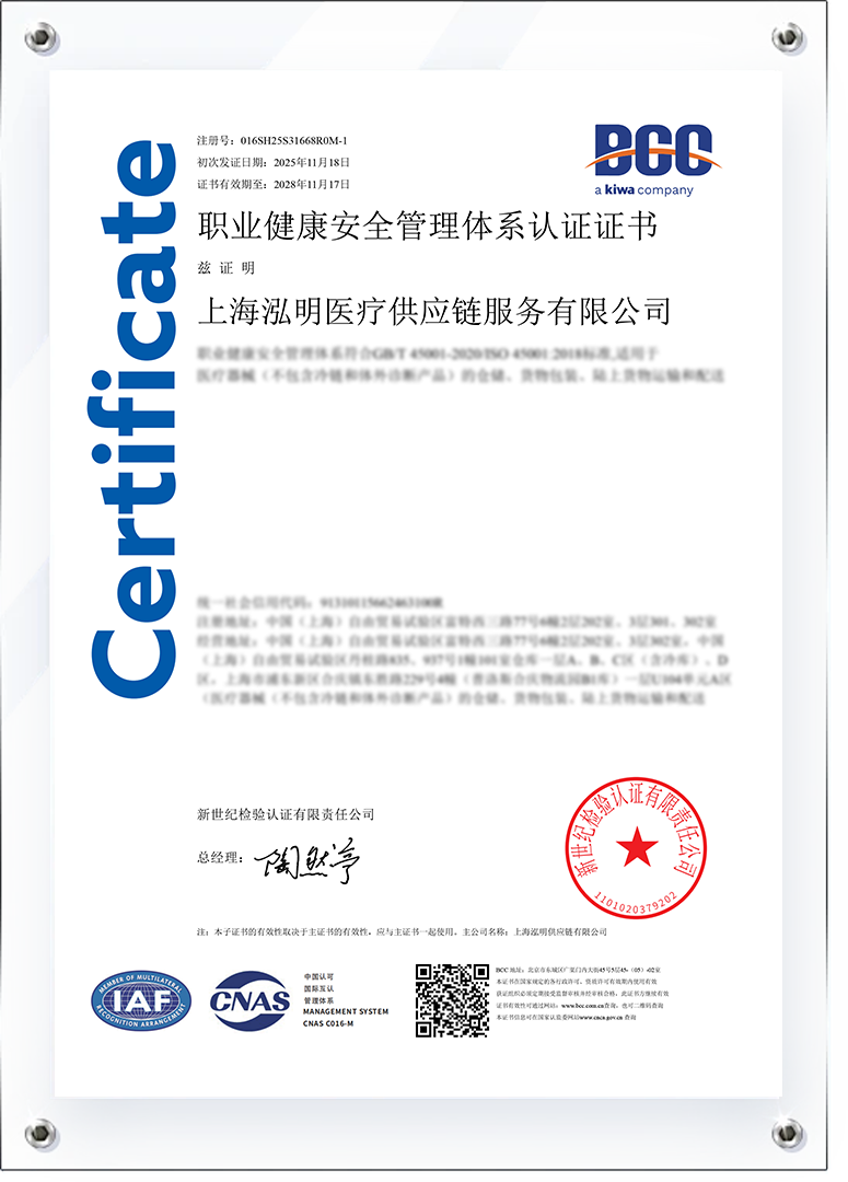 Recently, after stringent review and evaluation by an authoritative institution, Shanghai HMG Supply Chain Co., Ltd, Shanghai HMG Logistics Co., Ltd., and Shanghai HMG Medical Supply Chain Service Co., Ltd., three subsidiaries of HMG Group, simultaneously obtained the ISO 45001:2018 Occupational Health and Safety Management System certification. This achievement establishes HMG Group as one of the benchmark enterprises in the industry to fully align with international standards in occupational health and safety management.