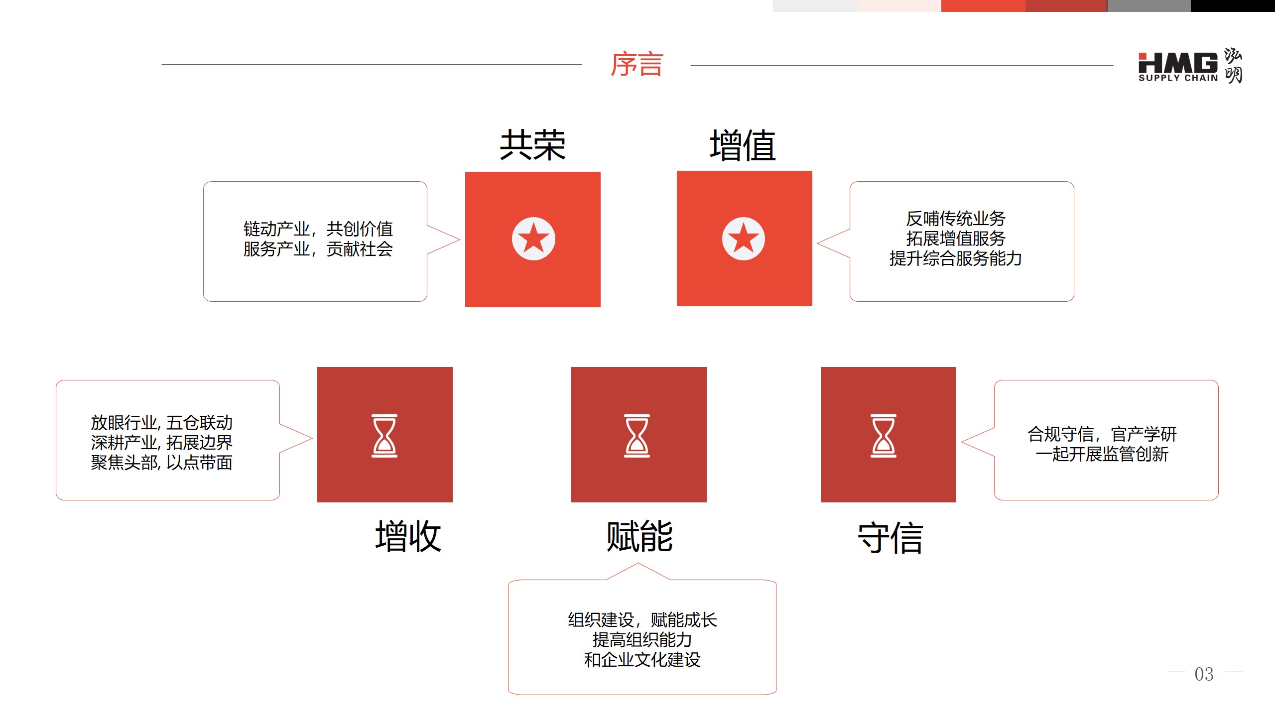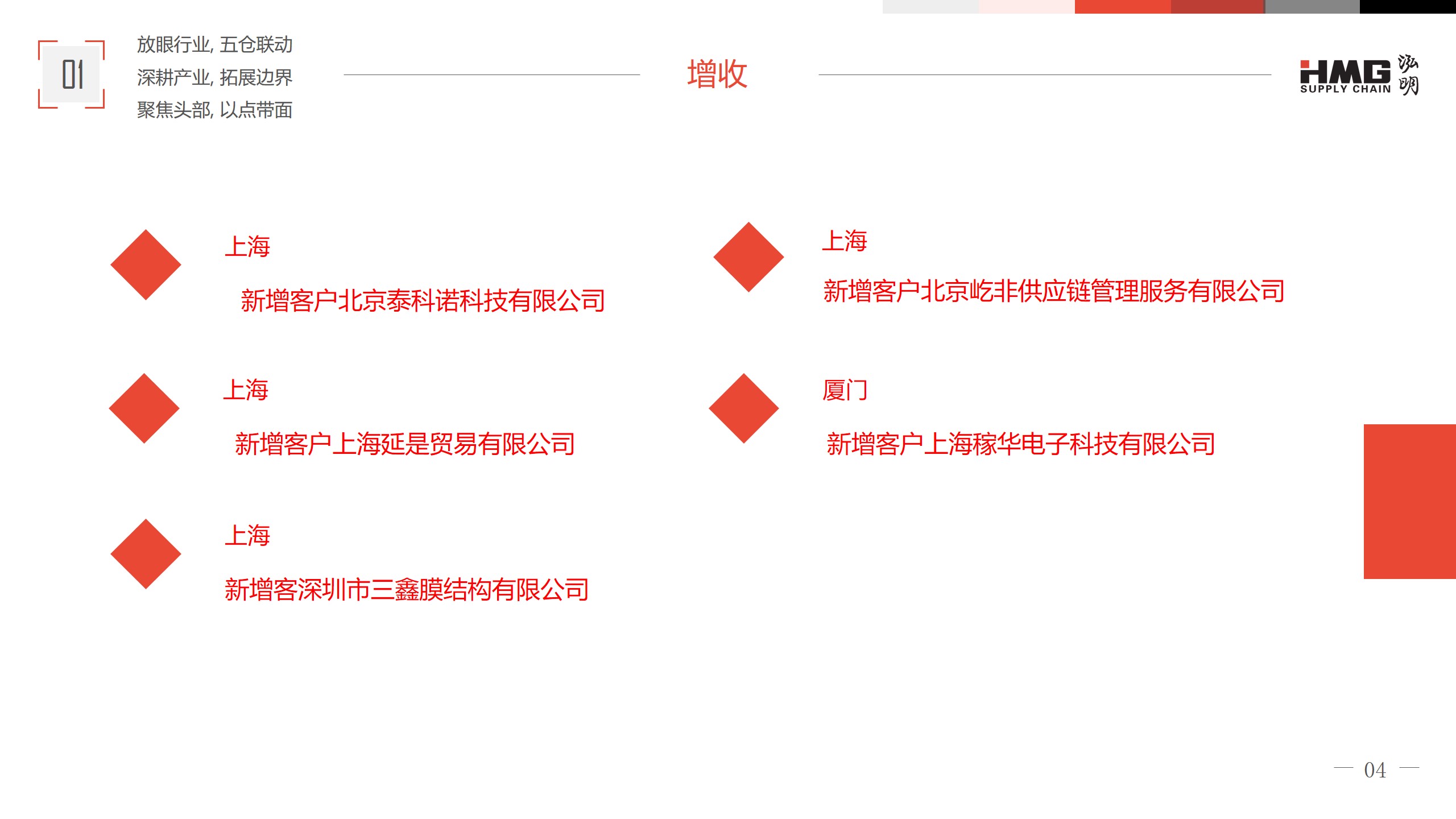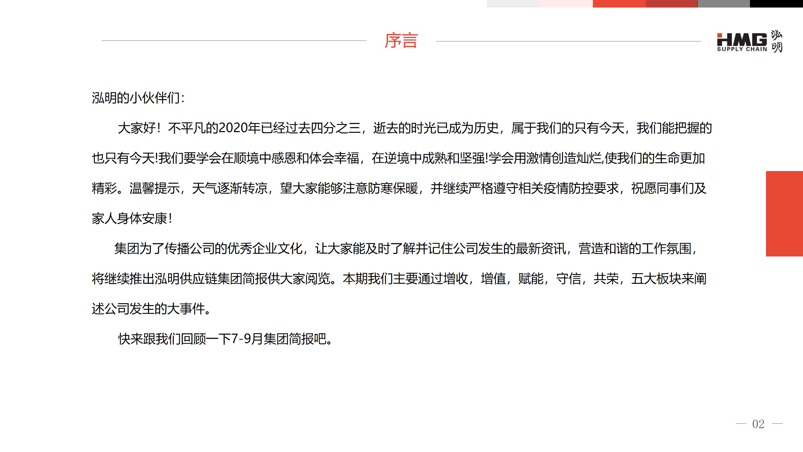 集团为了传播公司的优秀企业文化,让大家能及时了解并记住公司发生的最新资讯,营造和谐的工作氛围,将继续推出泓明供应链集团简报供大家阅览。本期我们主要通过增收,增值,赋能,守信,共荣,五大板块来阐述公司发生的大事件。